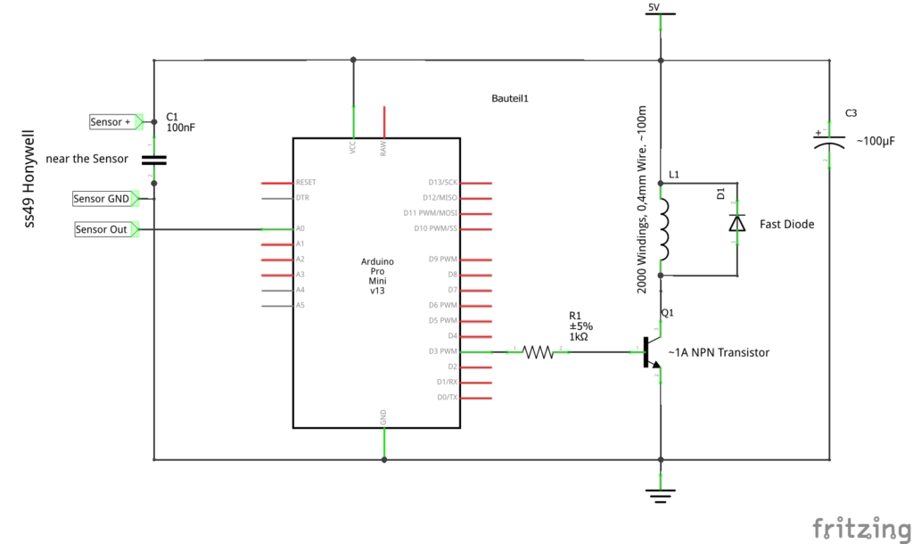 This is the most complex part of this project, below you can see the circuit diagram. The Arduino is wired with the Hall Effect Sensor thought a resistor. And the inductor have a flyback protection Diode (1N4148) to prevent the current generated by the magnetic field in the inductor fries everything. There is also an power LED indicator and N-Channel Transistor (IRF540) to handle the high current to the coil.