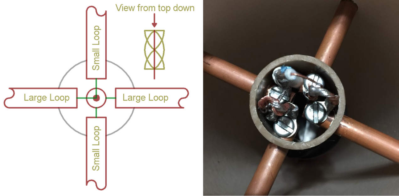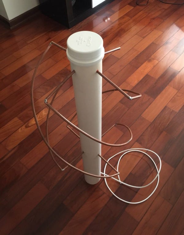 The outer tube is designed to be the antenna support and help with the water & dust protection. And the shorter inner tube is designed to frame the helix frame and the balun. The balun is a four turn inductor made with the cable to reduce the overall interference, photo in the gallery below. The antenna have four helix, two shorter and two larger. See the table in Materials to get the full dimensions. Since this antena is RHCP the helix needs to be turn anti-clockwise to work. The cable is a common coaxial cable, fancy shielding isn’t required for this length and frequency.