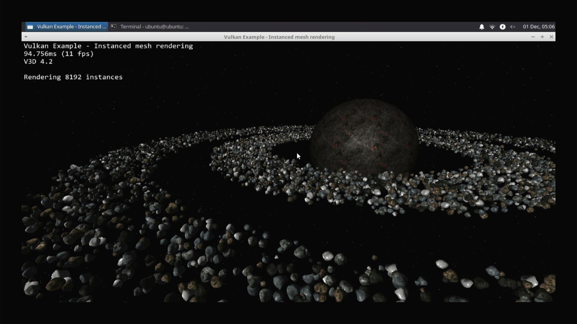 Here, the culprit was the VkPhysicalDeviceFeatures::textureCompressionBC missing support. This feature is useful to compress the textures on the GPU to reduce memory usage. Luckily, the Raspberry Pi GPU has hardware support for the BC1, BC2, and BC3 formats. The game stopped crashing after I added support for VK_FORMAT_BC3_UNORM_BLOCK and VK_FORMAT_BC1_RGB_UNORM_BLOCK to the driver. The image above shows the instancing example from an old version of Sascha Willems' Vulkan demos that requires texture compression working as expected.